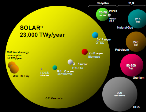 The sun daily irradiates on earth about 10'000 times more energy than the amount daily used from mankind. Otherwise said: the amount of energy that reaches the earth in less than one hour, answers the yearly need of energy of the world population.