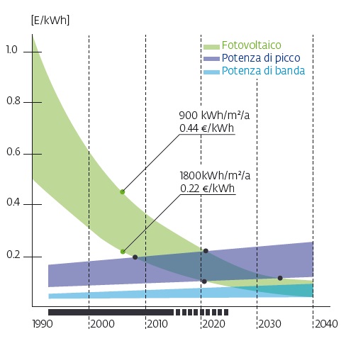The PV curve (green) is an interval whose endpoints are the costs of photovoltaics respectively for the north (900kWh/m2/year) and south Europe (1800kWh/m2/year).